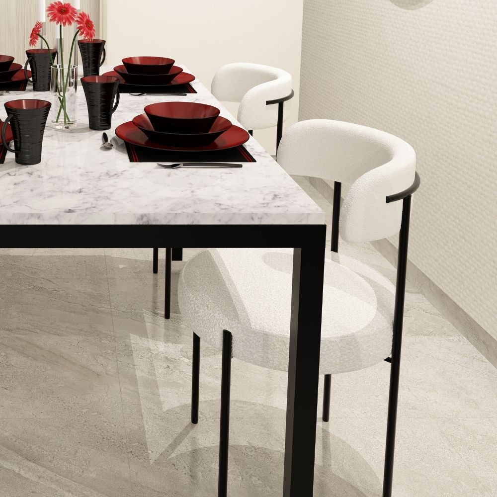 | Kullanılan Malzeme | Masa - Ayak: Metal, Tabla: Beyaz Mermer Sandalye - Ayak: Metal, Tabla: Kumaş |